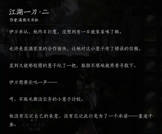 在游戏的序章中,千夜突然来袭,伊刀和主角等人在酒窖前奋力保护受苦百姓,与千夜一方展开激战。千夜的实力强大,伊刀不敌他,部分百姓被带走,主角与千夜追至地宫。在与千夜的对战中,初出茅庐的主角难以将其击杀,关键时刻江宴赶来救场。