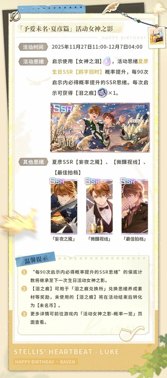11月27日,夏彦生日活动「予爱未名·夏彦篇」即将开启!夏彦生日SSR【鸥字回时】概率提升,每90次启示内必得概率提升的SSR思绪,完成活动限时任务可获得夏彦R思绪【迎翼】、生日限定邀请函【观忆】、活动纪念徽章【予爱·慕夏】及【女神之泪】等多重限定奖励,一起来和小编看看吧~