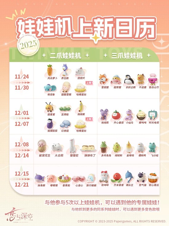 恋与深空「娃娃机上新」咕嘟蛋挞现已正式加入~11月24日~12月7日,咕嘟蛋挞在二爪娃娃机的概率将会提升。12月1日~12月7日,幻想菇在二爪娃娃机等待和猎人们再见;12月15日~12月21日,软心南瓜将在三爪娃娃机等待和猎人们再见,一起来和小编看看吧~