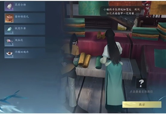 到达该位置后找到NPC绾儿并与之对话触发任务。对话结束后根据任务指引寻找另一位NPC苏晴,在与苏晴对话时选择“寒暄两句”选项即可获得凤仙花道具。
