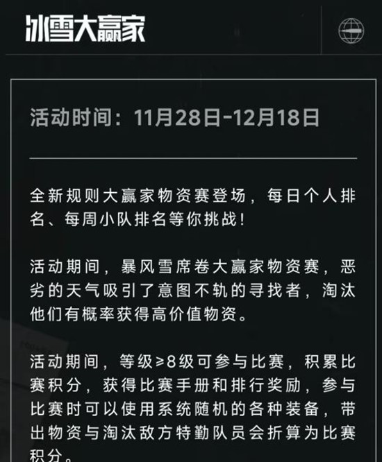 《暗区突围》即将开启一项全新的活动——冰雪大赢家物资赛,为玩家们带来一系列精彩的赛事和丰厚的奖励。本次活动将于11月28日至12月18日举行,期间玩家将有机会参与个人排名、小队排名等挑战,赢取限定外观、冰狮雕像藏品等珍贵奖励。