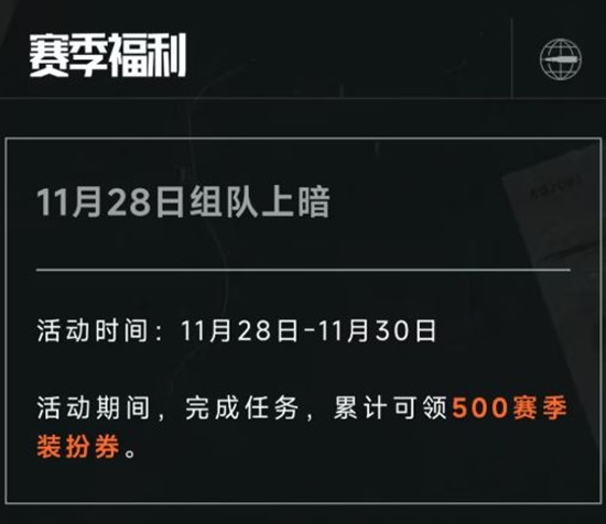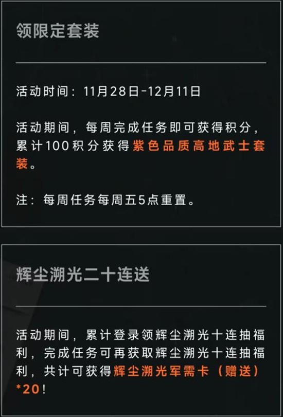 完成对应任务即可领取赛季福利,包括辉尘溯光二十连抽、500赛季装扮券、限定套装等。