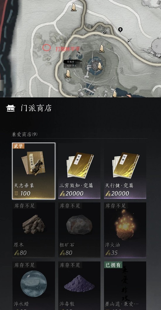 ①天志垂象(手甲),墨山道门派商店购买手甲武学和2篇心法(三穷致知+天行健)