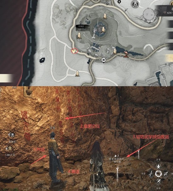 百炼坊传送南边山洞内跟NPC吴智对话→跟墙面交互→切换明川药典使用武学技→拔剑赠送吴智