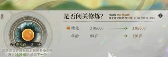 演化周期为50年,当精元耗尽时,无论演化是否完成,都可以选择闭关恢复精元。在此期间,主角的年龄会逐渐增长,如果超过寿元上限,就无法继续演化。