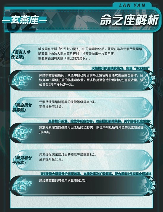 舞袂翩兮扬玉霓:凤缕护盾存在期间,队伍中自己的当前场上角色的普通攻击造成伤害时,会恢复40%凤缕护盾的伤害吸收量,至多恢复至创造护盾时的伤害吸收量,该效果每2秒至多触发一次。