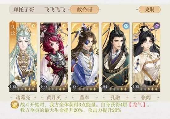 配队:诸葛亮,黄月英,张闿,董奉,孔融
