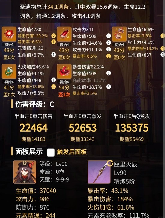 (圣遗物很好刷全找双爆和生命,但不知道为什么伤害感觉不是很高,但也还过得去)