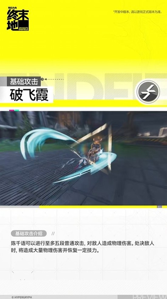 陈千语可以进行至多五段普通攻击,对敌人造成物理伤害。处决敌人时,将造成大量物理伤害并恢复一定技力。
