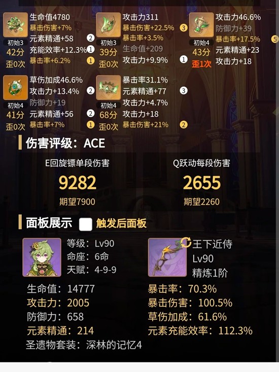 建议:我的面板充能较低,建议不低于170%,攻击力1800+。带上深林四件套的柯莱作为副c,还是一个脱手副c,可以作为草队的替代副c,还是很好用的,在没有更好的草元素角色可以用的时候,柯莱和草主是不二之选。