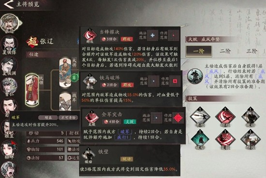 第三技能全军出击可为周围己方单位施加破军状态,持续两个回合,提升其破防能力。若张辽担任队伍统帅,则额外为队友附加疾风状态,持续一回合,提升行动速度。该技能具备较强的团队增益效果,能够在关键时刻改变战局节奏,尤其适用于需要快速推进或打断敌方部署的对局场景。