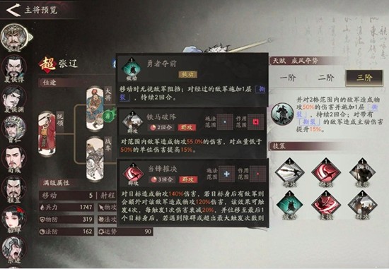 张辽的第一技能为当锋摧决,可对目标造成140%的物理伤害。若目标身后存在敌军,则会对其追加120%物攻伤害。技能升至满级后,该效果最多可连续触发四次,每次触发后伤害递减20%,并使张辽位移到最后一次命中目标的身后位置。若过程中遇到地形障碍或达到触发上限,则技能效果终止。