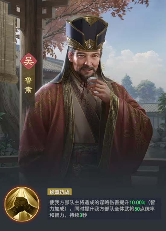 鲁肃则在阵容中扮演辅助型副将角色,侧重于提升全队弓兵作战效能。他可通过弓兵专精与远程打击类技能强化兵种优势,同时为团队提供攻击与防御加成。当其智力属性得到提升后,还能间接增强队友的输出表现。在恢复类技能选择上,军医可提供稳定的兵力比例回复,而智谋加持则能提高全队智力属性,进一步放大周瑜与孙权的技能收益。
