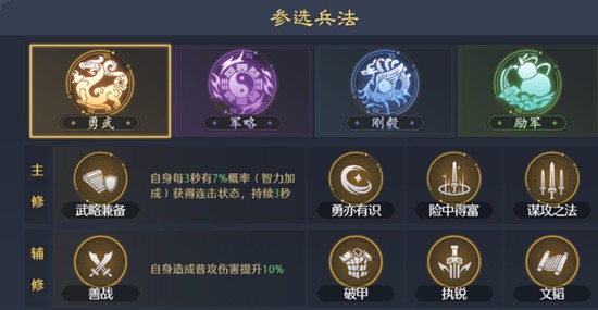 勇武派系是专为输出型武将设计的兵法路线,在九牧之野中适用于高爆发或连击类角色。夏侯渊、于禁、华雄、马腾、徐晃等武将都适合装配此类兵法。该派系侧重提升物理伤害、破甲效果以及连击概率,能够显著增强武将在战斗中的持续输出能力。选择勇武作为主修派系时,可明显感受到队伍前几轮的爆发力提升,尤其适合以快速击杀为目标的阵容配置。