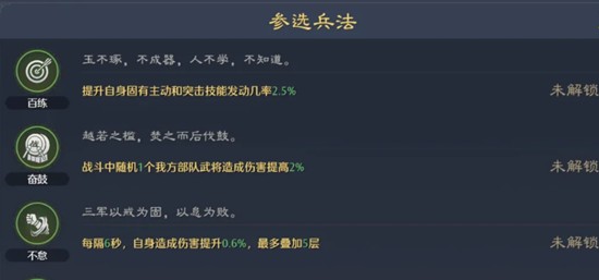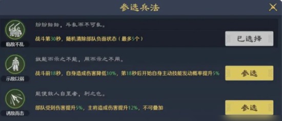 军略派系主要服务于拥有强力主动技能的武将,在九牧之野中推荐关羽、吕布、诸葛亮等依赖战法输出的角色使用。这类兵法通过提高主动技能的发动率或强化其效果来提升整体战斗力。例如“临危不乱”“示敌以弱”“诱敌而击”等兵法,均能对技能触发概率或伤害倍率产生正面影响。由于其效果直接作用于核心技能,因此在搭配高技伤武将时表现尤为突出。