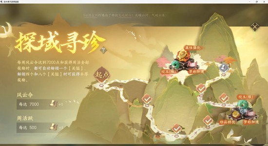 每周做满五次任务可推进一次探域寻珍,每周获取7000风云令还能再推进一次,即每两周能拿到一些限玉。