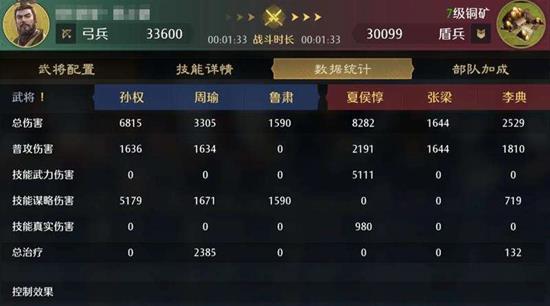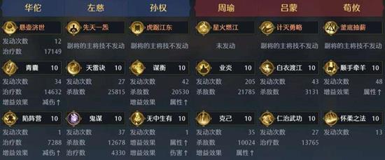 从实战战报来看,队伍的整体增益百分比非常高。有些玩家认为孙权携带群体技能有些浪费,此时也可以将周瑜调整为主将,让孙权转而携带辅助类技能卡,为周瑜创造更好的输出环境。