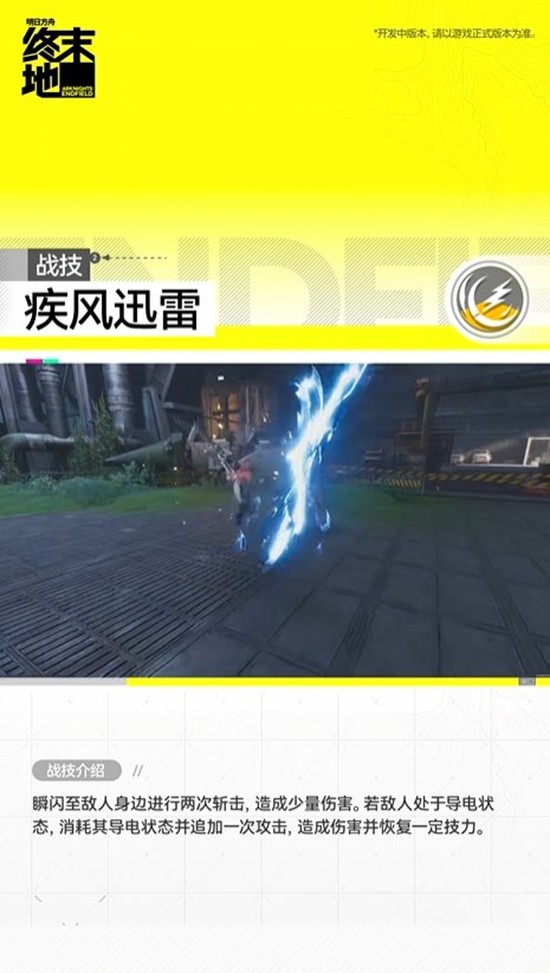 瞬闪至敌人身边进行两次斩击,造成少量伤害。若敌人处于导电状态,消耗其导电状态并追加一次攻击,造成伤害并恢复一定技力。