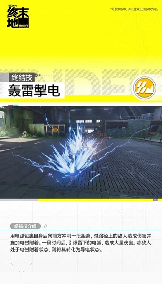 用电弧包裹自身后向前方冲刺一段距离,对路径上的敌人造成伤害并施加电磁附着。一段时间后,引爆留下的电弧,造成大量伤害。若敌人处于电磁附着状态,则将其转化为导电状态。