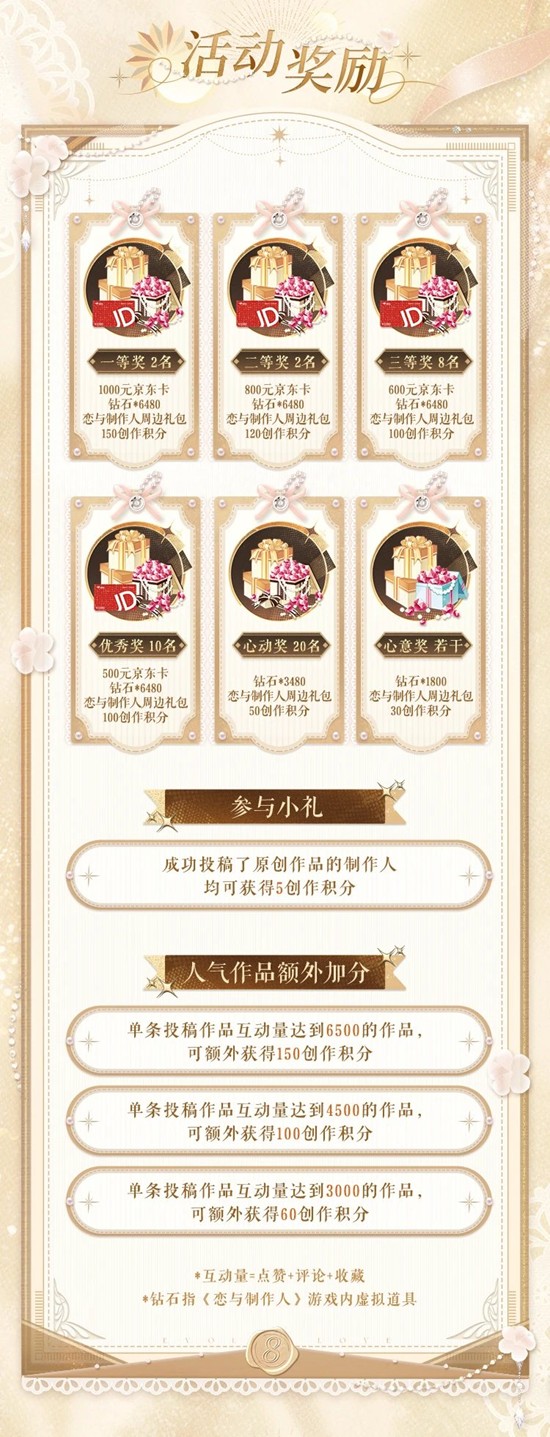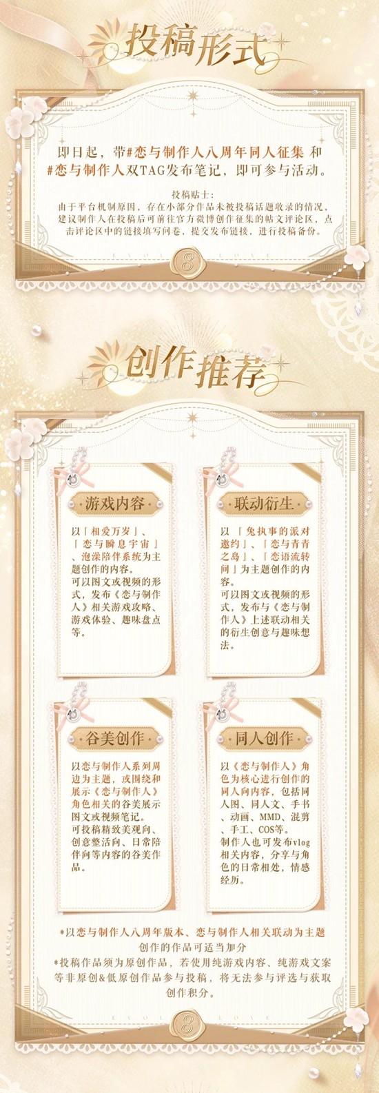 即日起,带#恋与制作人八周年同人征集 和#恋与制作人 双tag发布笔记,即可参与活动。