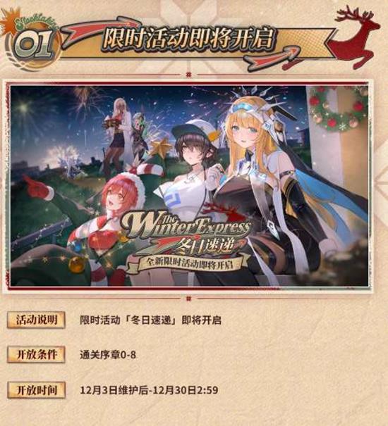 《交错战线》冬日速递版本将于12月3日正式上线,玩家们可以期待在这个冬日里,与游戏中的角色们一起度过一个充满欢乐和惊喜的季节。别忘了参与各项活动,赢取丰厚的奖励哦!