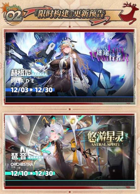 限时构建「迷途行者」和「悠游星灵」即将开启,灭刃六星队员“赫格尼”、乐团六星队员“琶音”登场,且构建获得该队员概率提升!
