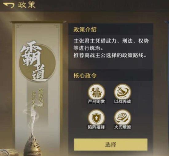 在九牧之野中,政策系统为玩家提供了三种核心的发展方向,分别是霸道、王道和衡道。选择不同的政策路线,将直接影响你在九牧之野世界中的游戏体验和战略定位。霸道路线侧重于军事扩张与快速掠夺,适合喜欢主动出击、通过战斗获取资源的玩家。王道路线则更注重于自身实力的稳健发展与关键战役的爆发力。而衡道路线强调联盟协作与辅助支援,是团队中不可或缺的后勤保障力量。