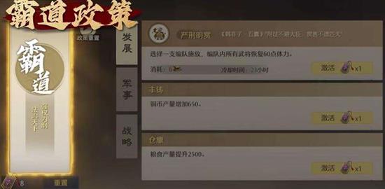选择霸道路线的玩家,可以解锁一系列强化战斗与资源掠夺的技能。“严刑明赏”技能能够恢复三名武将的体力,在游戏前期开荒、打野和抢占土地时非常实用。“丰铸”与“仓廪”技能则能分别提升铜币和粮食的基础产量,有助于前期的资源积累。此外,“以战养战”是一个特色技能,它能在每次战斗后,根据击败的敌军数量为玩家带来额外的资源收益,完美体现了霸道政策以战养战的核心理念。