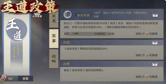 如果你倾向于王道的发展路线,其技能组合将提供强大的攻防能力与战略灵活性。“更戌易帜”技能允许你将守军替换为克制敌方兵种的部队,在攻打高级土地时能起到奇效。“死战”技能则能提供可观的增伤与减伤效果,虽然会提高士兵的损耗率,但在点满技能后,还能额外获得战功提升并减少虎符消耗,适合在九牧之野的关键战役中一锤定音。