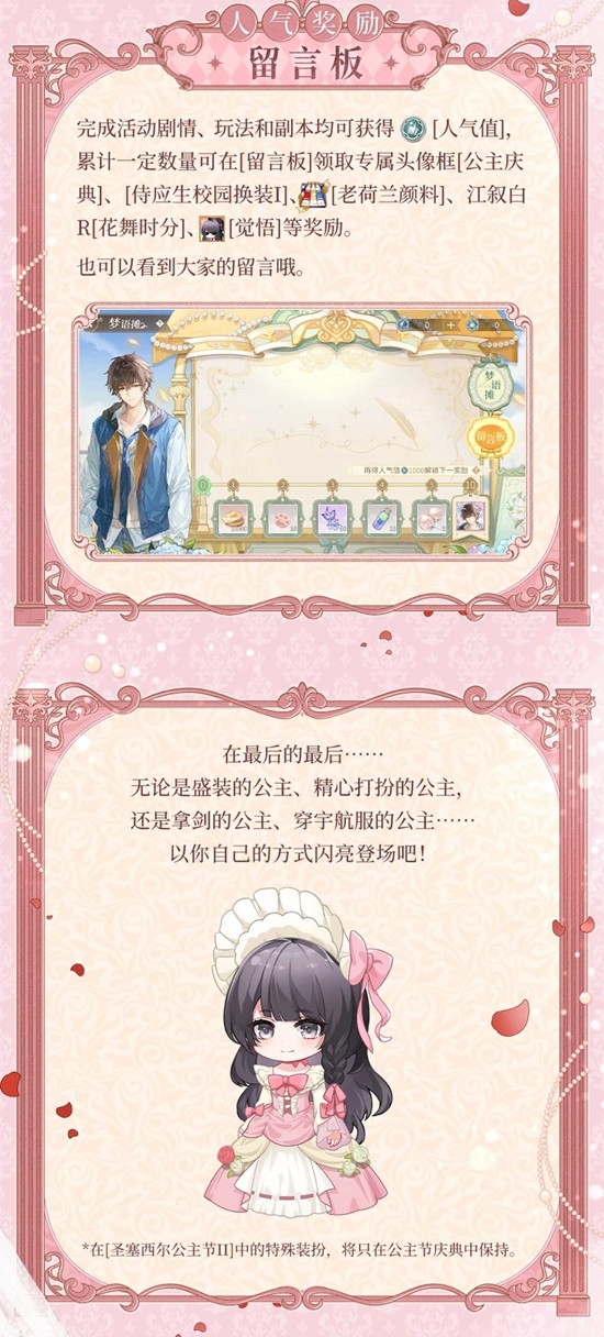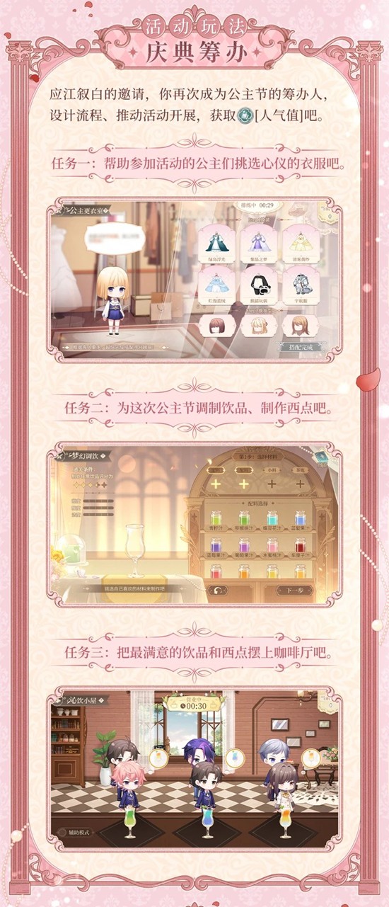 应江叙白的邀请,你再次成为公主节的筹办人,设计流程、推动活动开展,获取[人气值]吧。