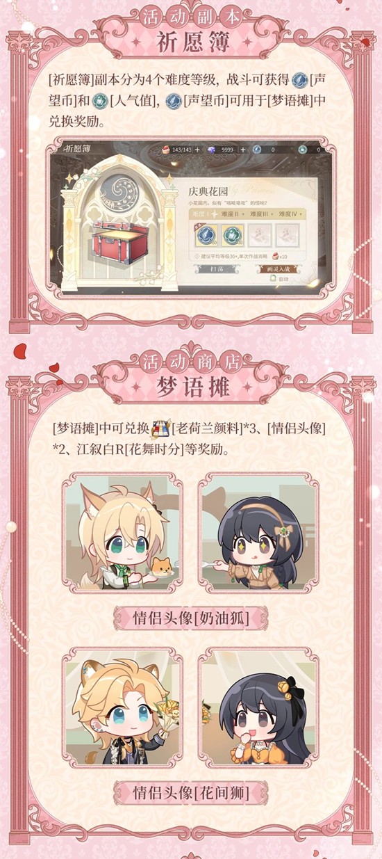 [祈愿簿]副本分为4个难度等级,战斗可获得[声望币]和[人气值),[声望币]可用于[梦语摊]中兑换奖励。