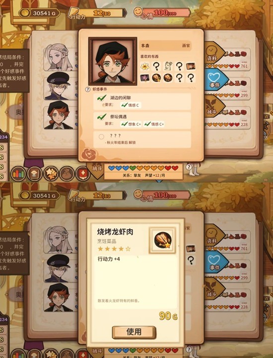 3、行动力恢复方式:床铺休息、野马湖休息、吃烹饪料理