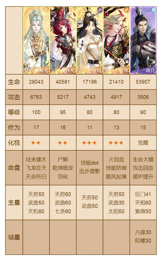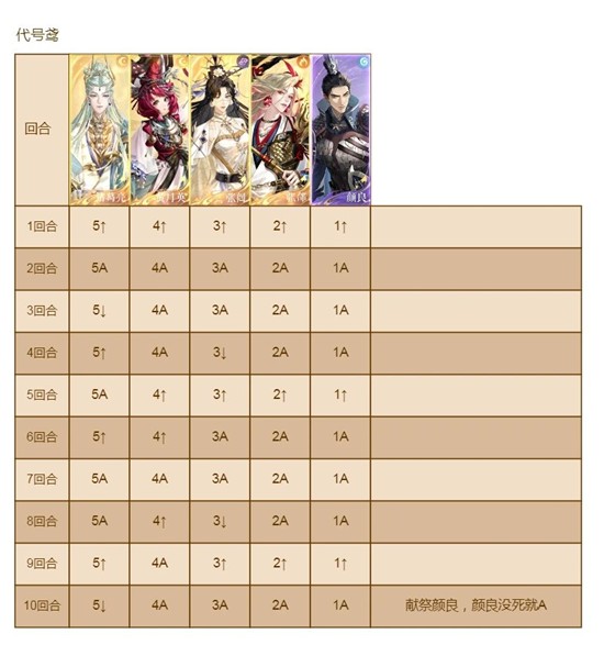 如果黄月英没有2星,则颜良可能因为少黄月英的2星天赋盾而死亡。颜良建议携带地抗辅星,如有贪狼也可携带。表格里张郃是全程攻击的,张郃如果有顺风盘,有花状态下拉防御可以给颜良奶一口。