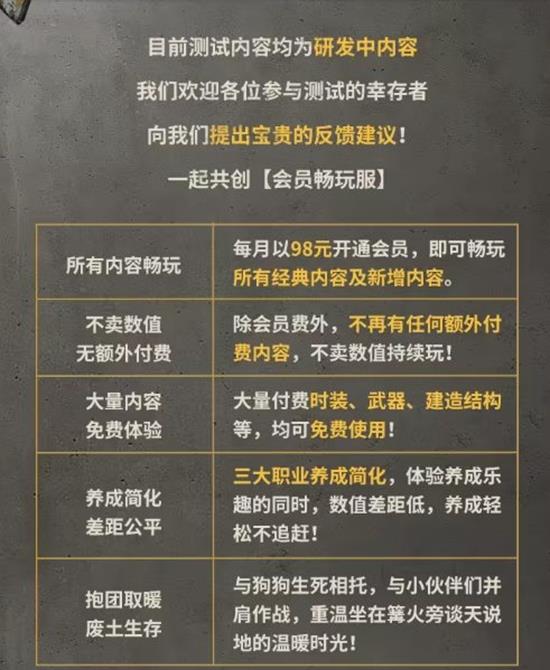 本次测试为付费删档测试,以98元开通会员,即可畅玩所有经典服及新增内容,且没有额外的付费内容。成功参与测试并开通会员的幸存者,可在服务器正式上线后获得1个月会员资格的返利。