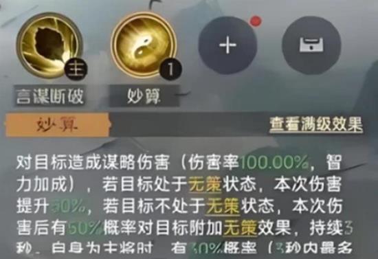 无策战法是诸葛亮兵法搭配的核心选择之一。该兵法能有效提升诸葛亮的谋略输出,并附带一定的控制效果,与他自身高额的谋略伤害相辅相成。当诸葛亮发动主动技能时,无策战法能进一步放大其技能收益,对敌方造成可观的谋略打击。