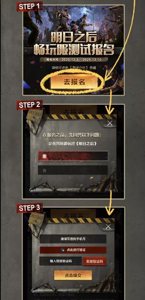 报名流程十分简单。进入活动页面后,点击“去报名”,回答几个关于《明日之后》的简单问题,然后填写正确的手机号并进行验证,即可完成报名。完成后,别忘了分享链接,邀请好友一起参与测试。