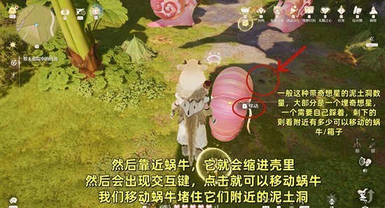 我们切换变大套,靠近蜗牛,它就会缩进壳里,这时候再靠近它们,会有交互键,可以移动蜗牛,将附近的泥土洞给堵上;