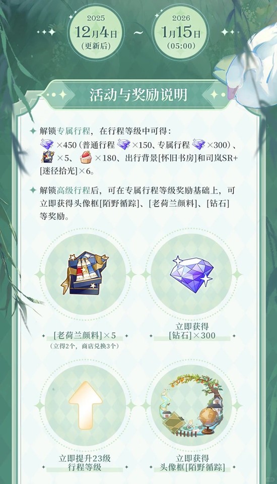 解锁高级行程后,可在专属行程等级奖励基础上,可立即获得头像框[陌野循踪]、[老荷兰颜料]、[钻石]等奖励。