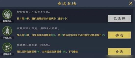 刚毅兵法是防御型武将的绝佳选择。像曹仁、程普、高顺这类承担前排坦克职责的武将,搭配刚毅派系的兵法能极大提升生存能力。该派系下的“百炼”、“奋鼓”、“不息”等兵法,可以增加固有主动或突击技能的发动概率,或是为随机友军提供伤害提升,在九牧之野的持久战中效果显著。