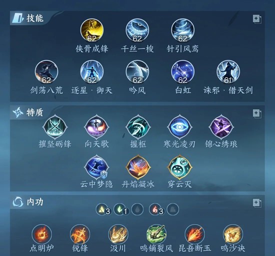 3. 内功。由于老绝技+1000会心,以及新的赛季小特质完全体,我把灵韵木破宵优化了,上了个3攻木鸣镝凑数,其余用好词条金火内功,伤害明显更高、更稳定了。主要是龙吟下不了玄机大特,我会心太高了,你们如果有同样的问题也可以尝试优化破宵/汲川,在词条好的内功里择优。