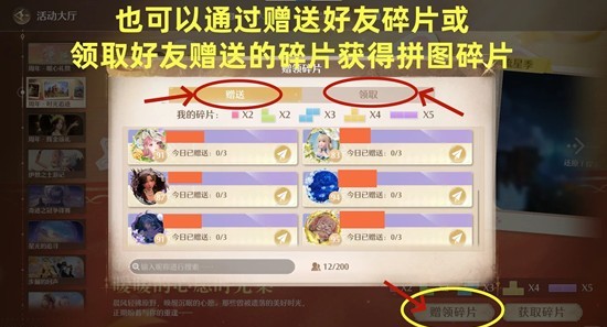 也可以点击旁边的赠领碎片,赠送好友碎片或者领取好友赠送的碎片;