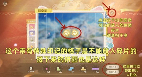 接着,我们点击继续拼图按钮,进到拼图页面后,我们看到右上角的小扫把图案,点一下可以把放进去的拼图碎片一键清除干净;