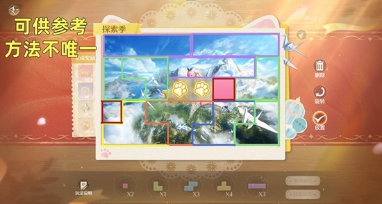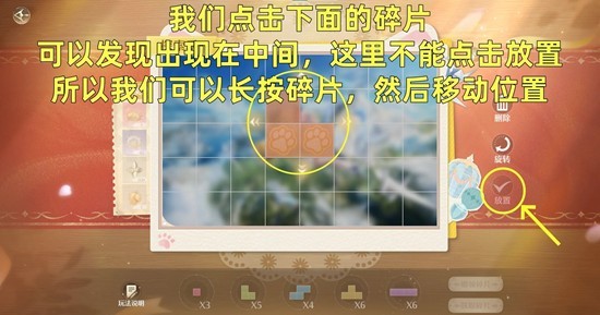 点击碎片后,这个碎片会出现在中间,有猫猫爪的两个格子是不可以放置的,接下来的12张图片也是类似,有特殊印记的格子是不能放置碎片的,需要我们长按碎片移动到其他位置上,就可以发现右边的放置按钮亮了,然后点击放置,碎片就会呆在那个位置上啦。