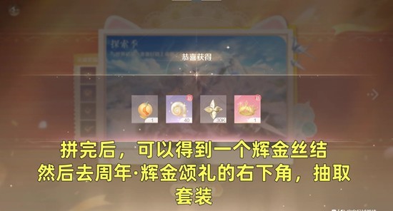 完成一张拼图后,可以得到一个辉金丝结,接着在活动-周年·辉金颂礼里抽取套装;