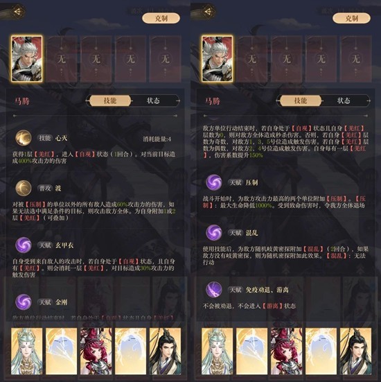 4n+1回合(大招后1回合)马腾进入【自观】状态,每次受击消耗一层【羌红】反击,孙权/孔融等多段攻击密探会消耗多层并受到多次反击。