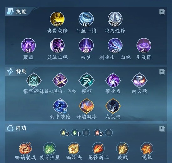 3. 内功。我的内功都没什么元素攻击开引灵阵后进攻分38万多点。你们根据进攻分选择就行,值得一说的是破戟这个内功很神奇,面板收益看着很垃圾实际上出伤还可以,有词条不错的可以搭配试试。