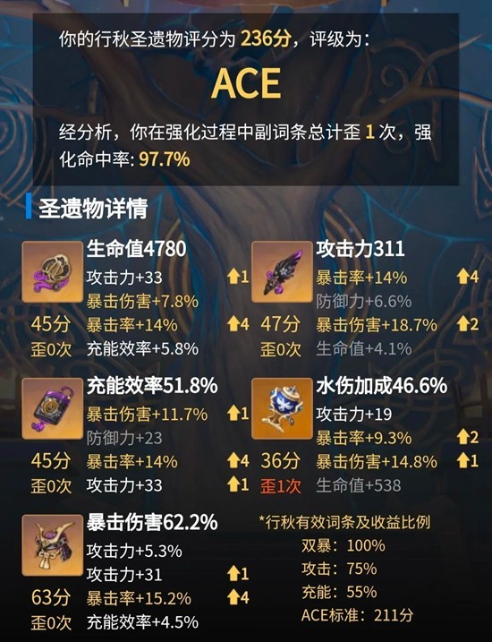 五个主词条顺序是生命-攻击-攻击-水元素伤害-暴击率。副词条优先暴击率>暴击伤害>攻击力>元素充能,其他副词条不推荐。