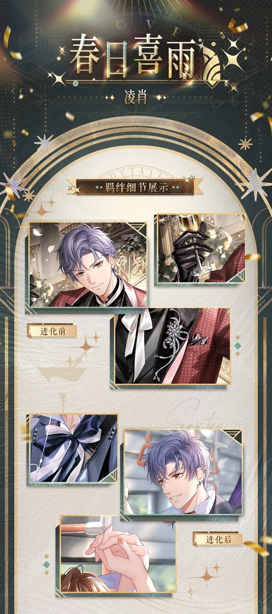 参与活动,自选获取SSR羁绊【凌肖·春日喜雨】与配套服装!获取指定道具,还可将进化后画面进行映绘升级,展示特殊流沙&动态背景效果。
