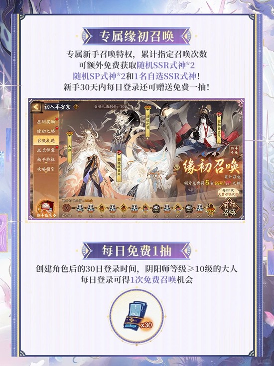 ※全新缘初召唤,30天内每日免费1抽,新手召唤特权可额外获取5位SSR/SP式神!