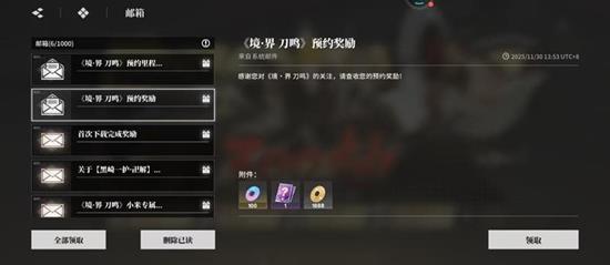 以上所有的境界刀鸣预约奖励,都是通过游戏内的邮箱系统统一发放的。领取路径很简单:进入游戏主界面后,点击右上角的邮箱图标,然后逐一领取未读邮件即可。整个流程只需要几秒钟,但需要注意每封邮件都设有有效期,虽然不是即时失效,但仍建议玩家每日登录后第一时间核查并领取,防止因延迟导致资源过期。